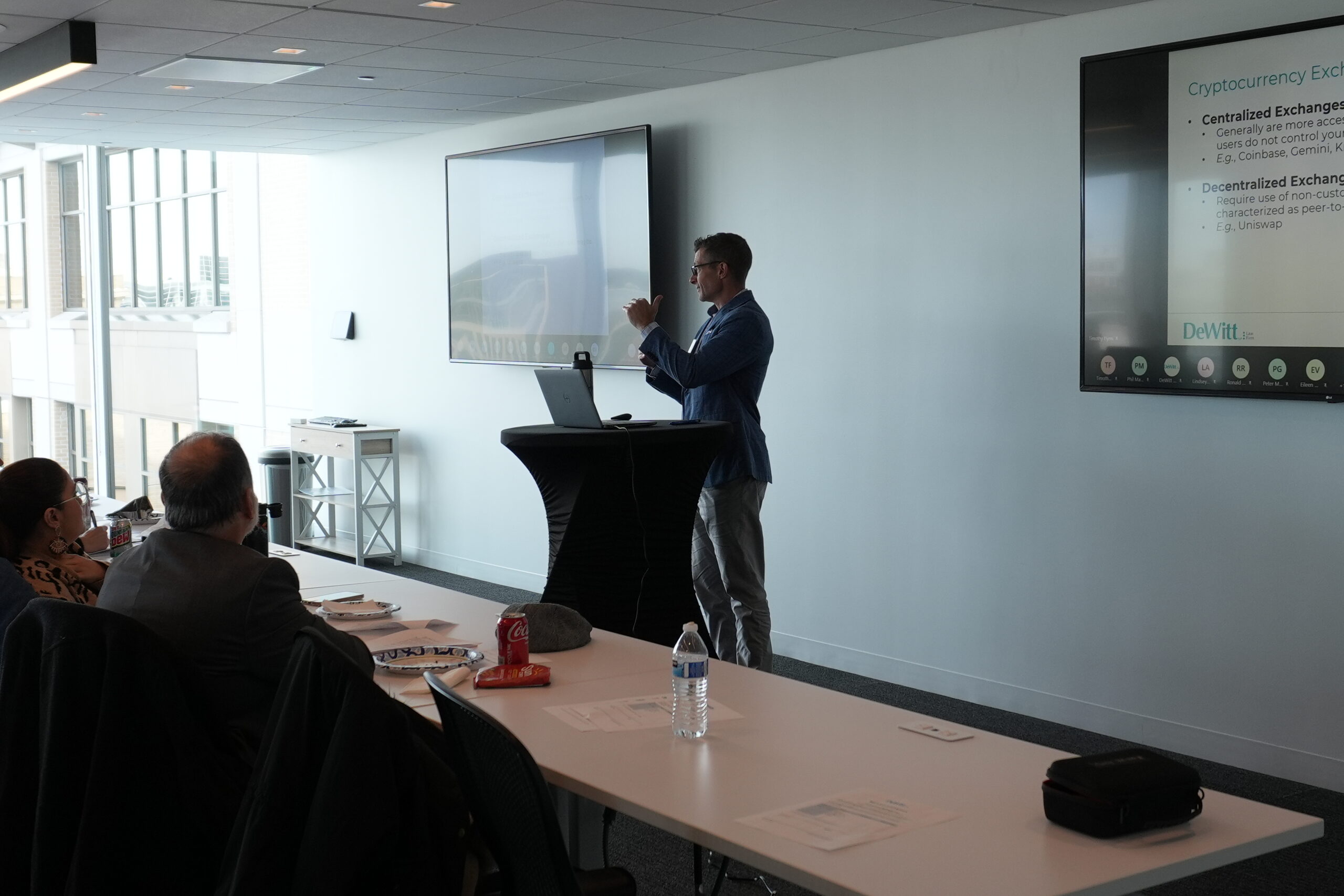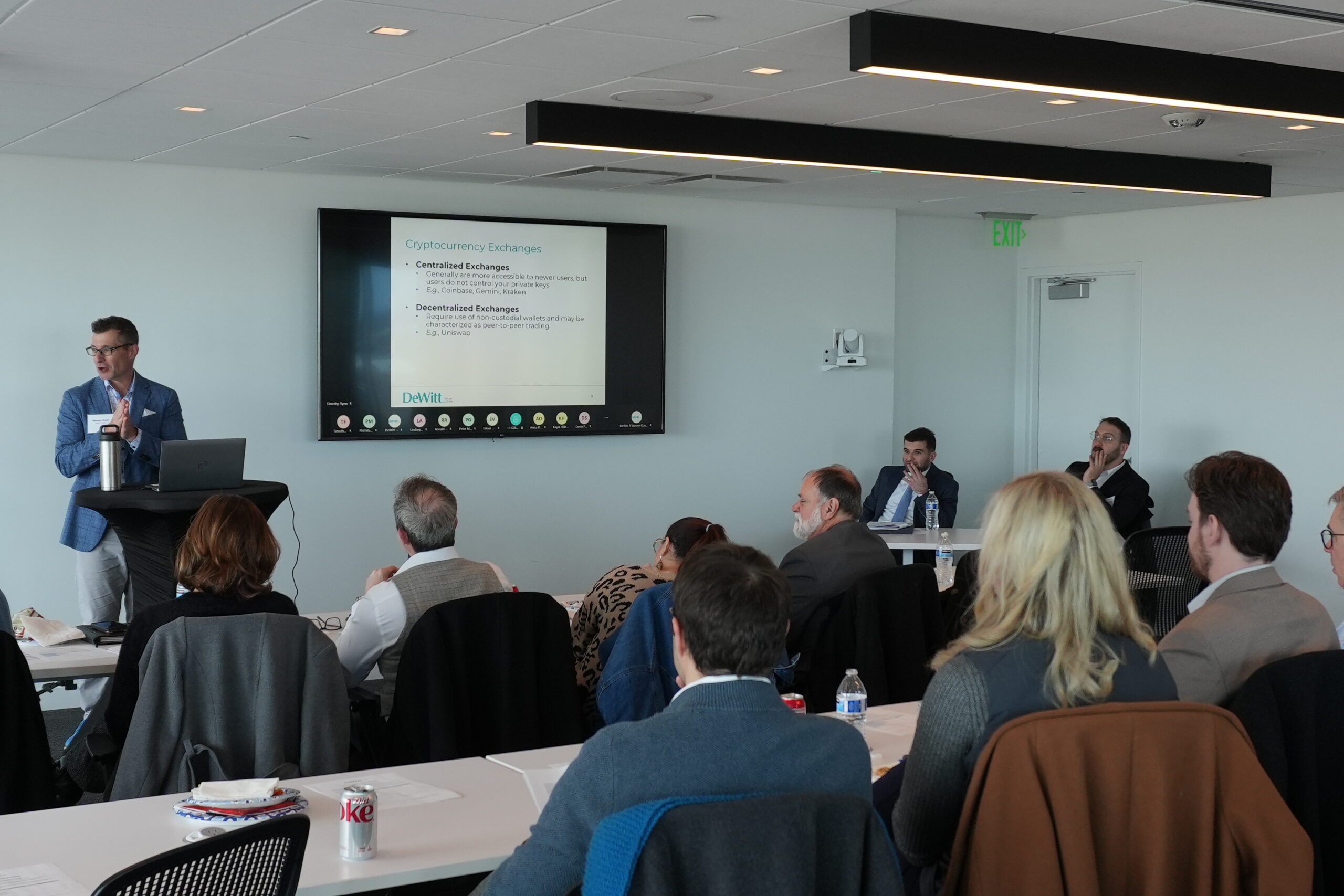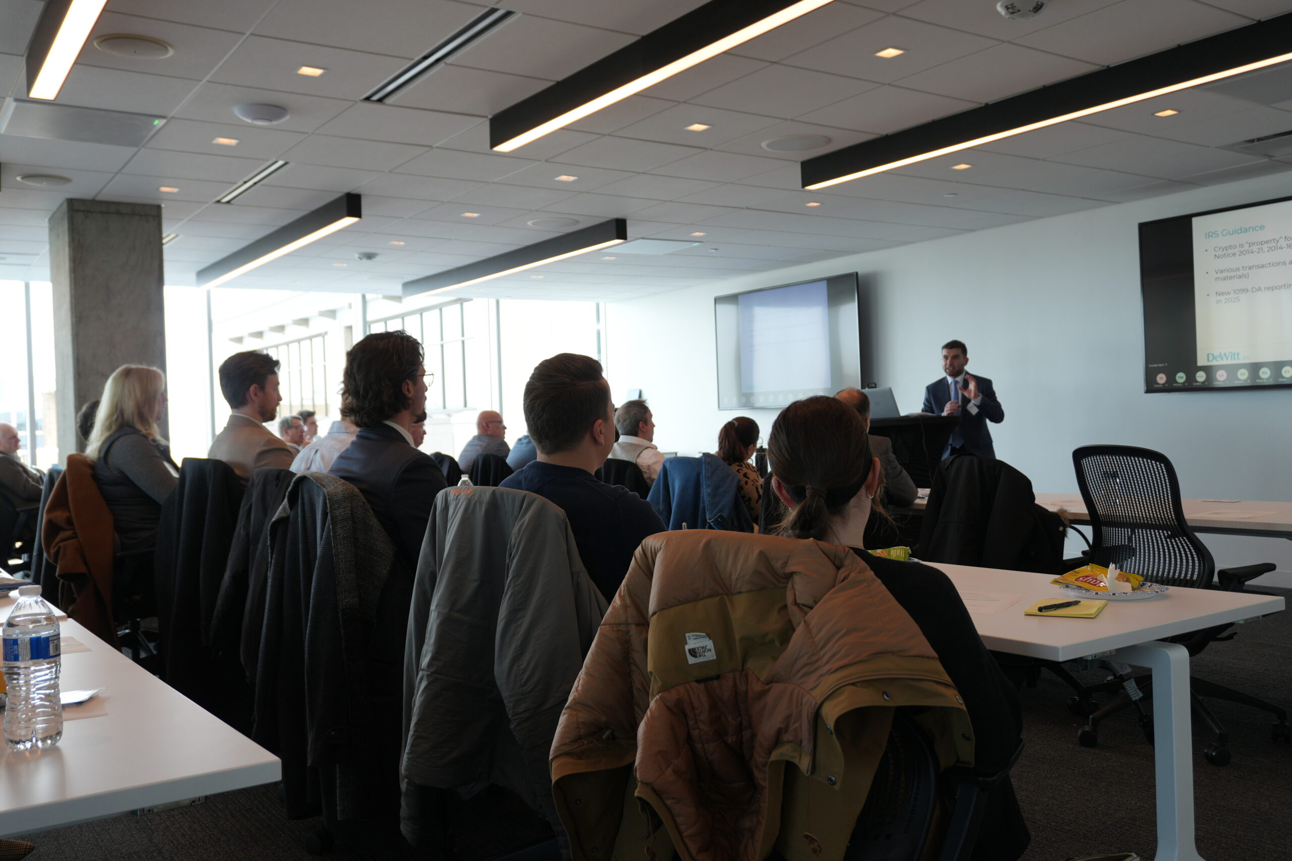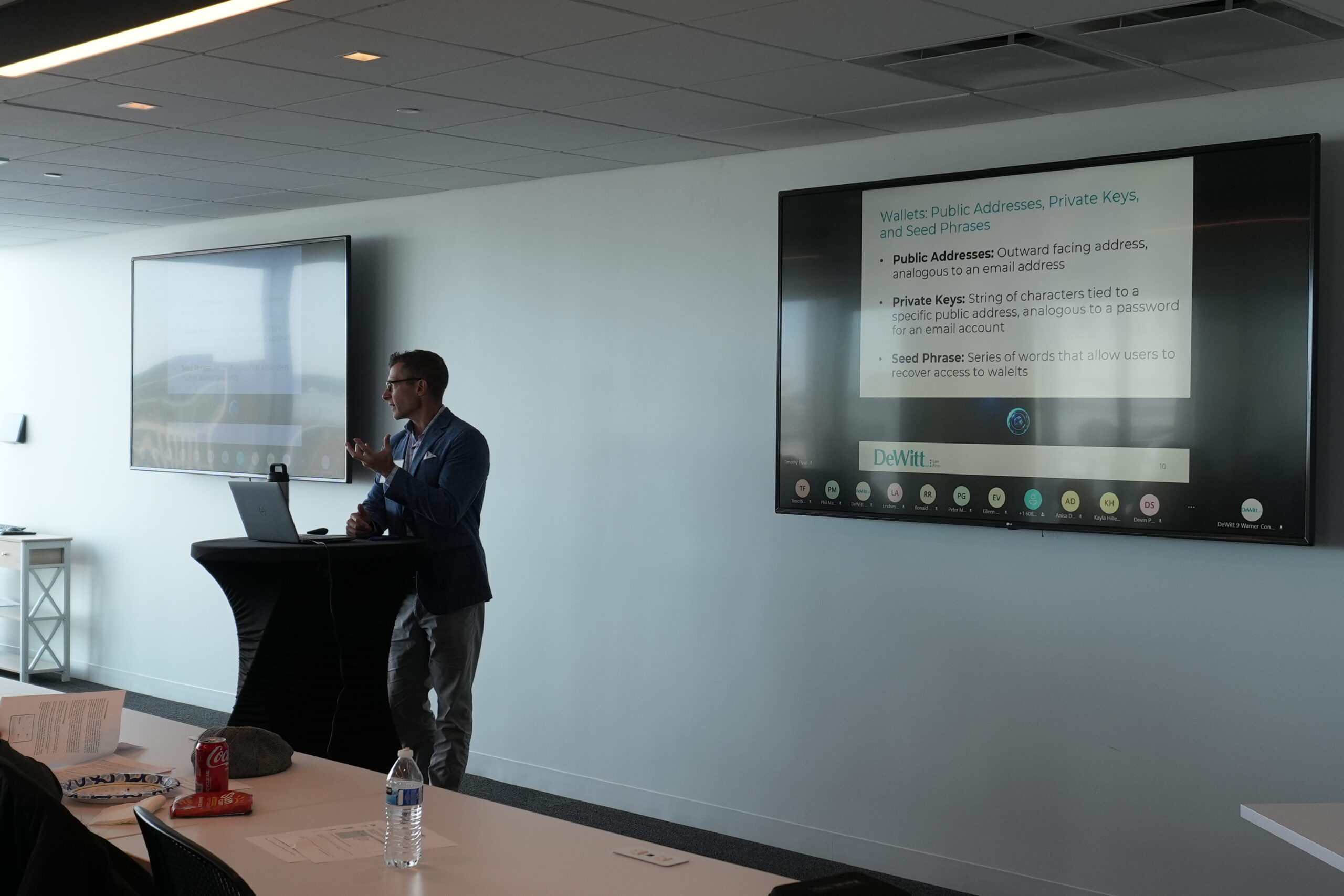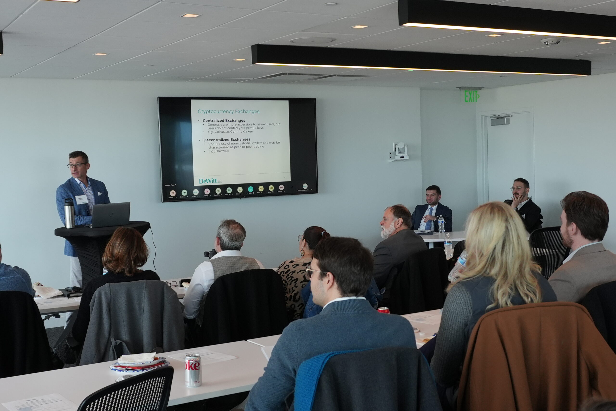 A packed-house at a DeWitt LLP in Madison with an audience of attorneys and financial planners focused on learning how blockchain and digital assets currently function from a legal and technical perspective.
