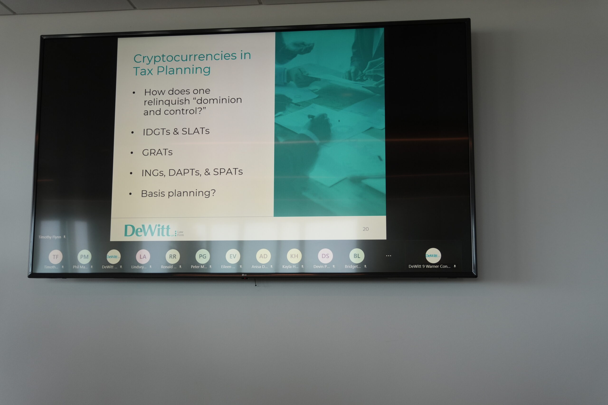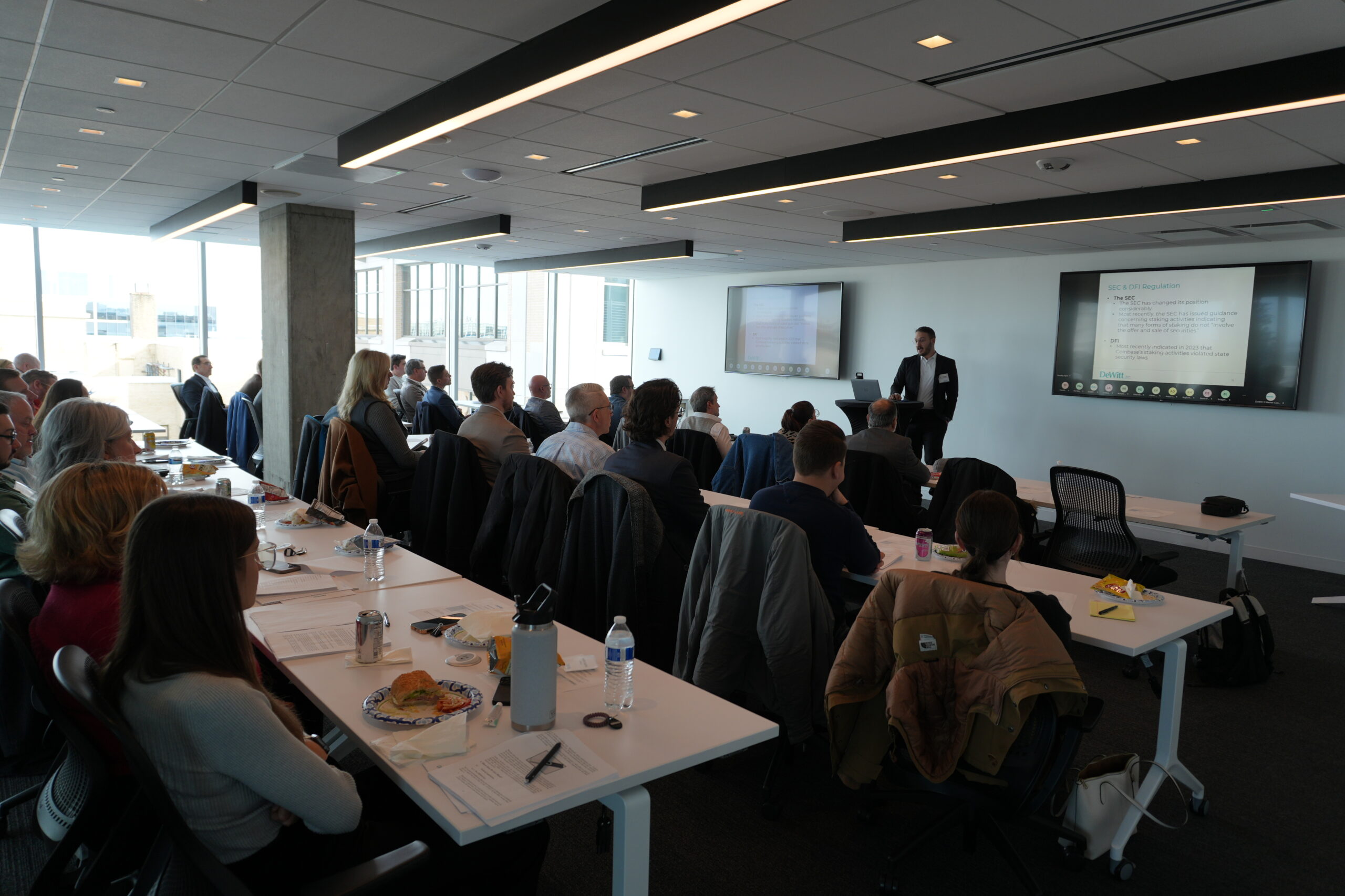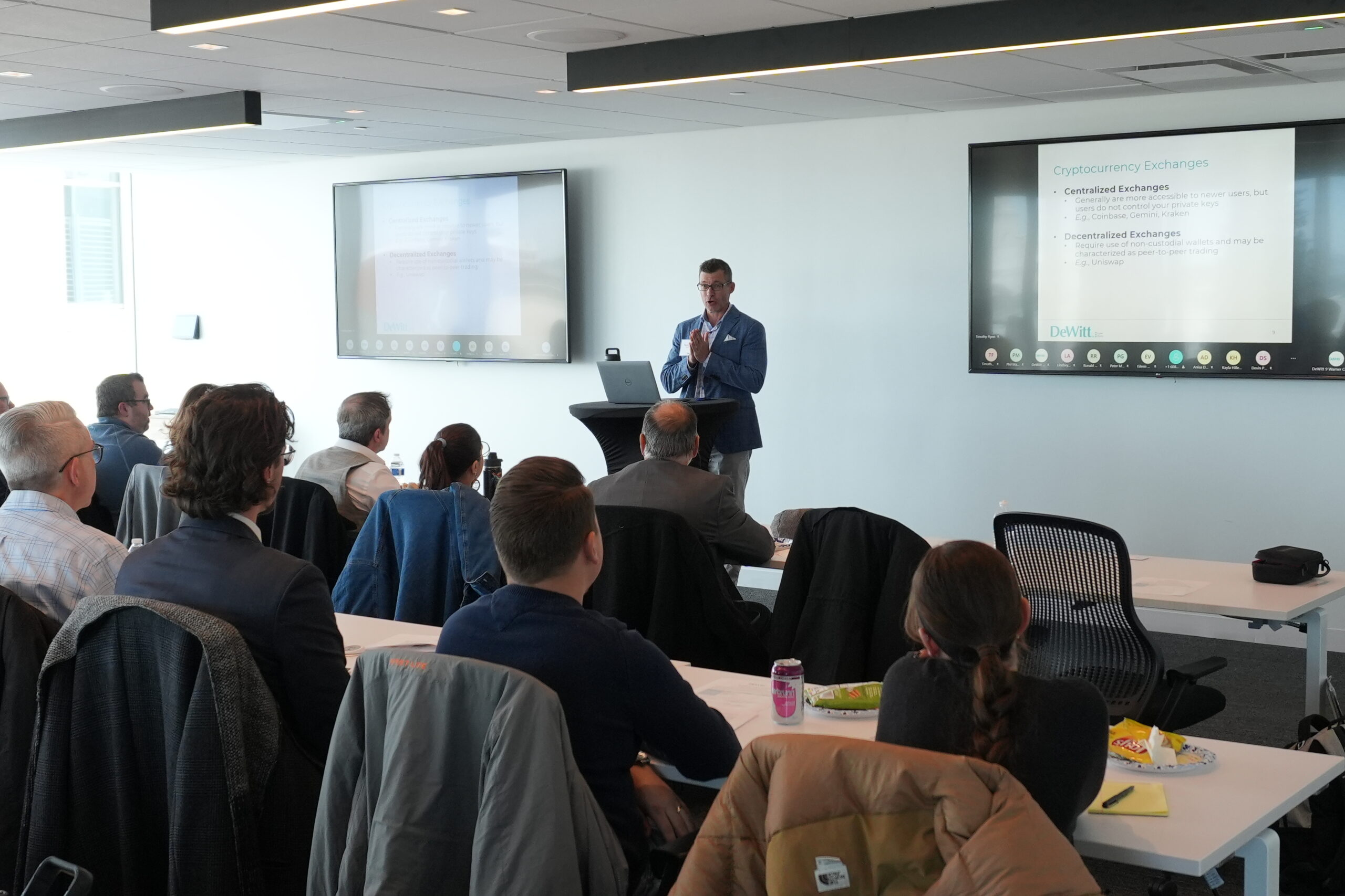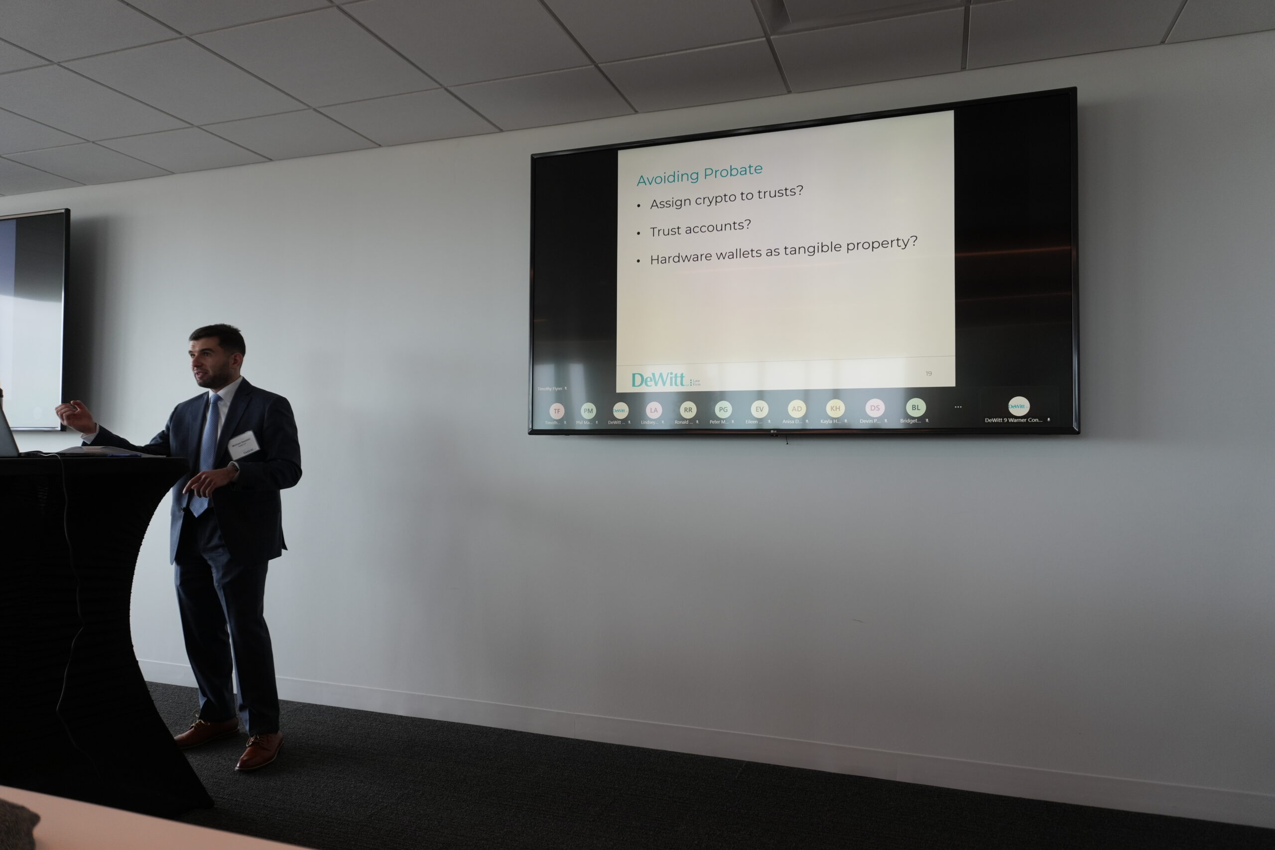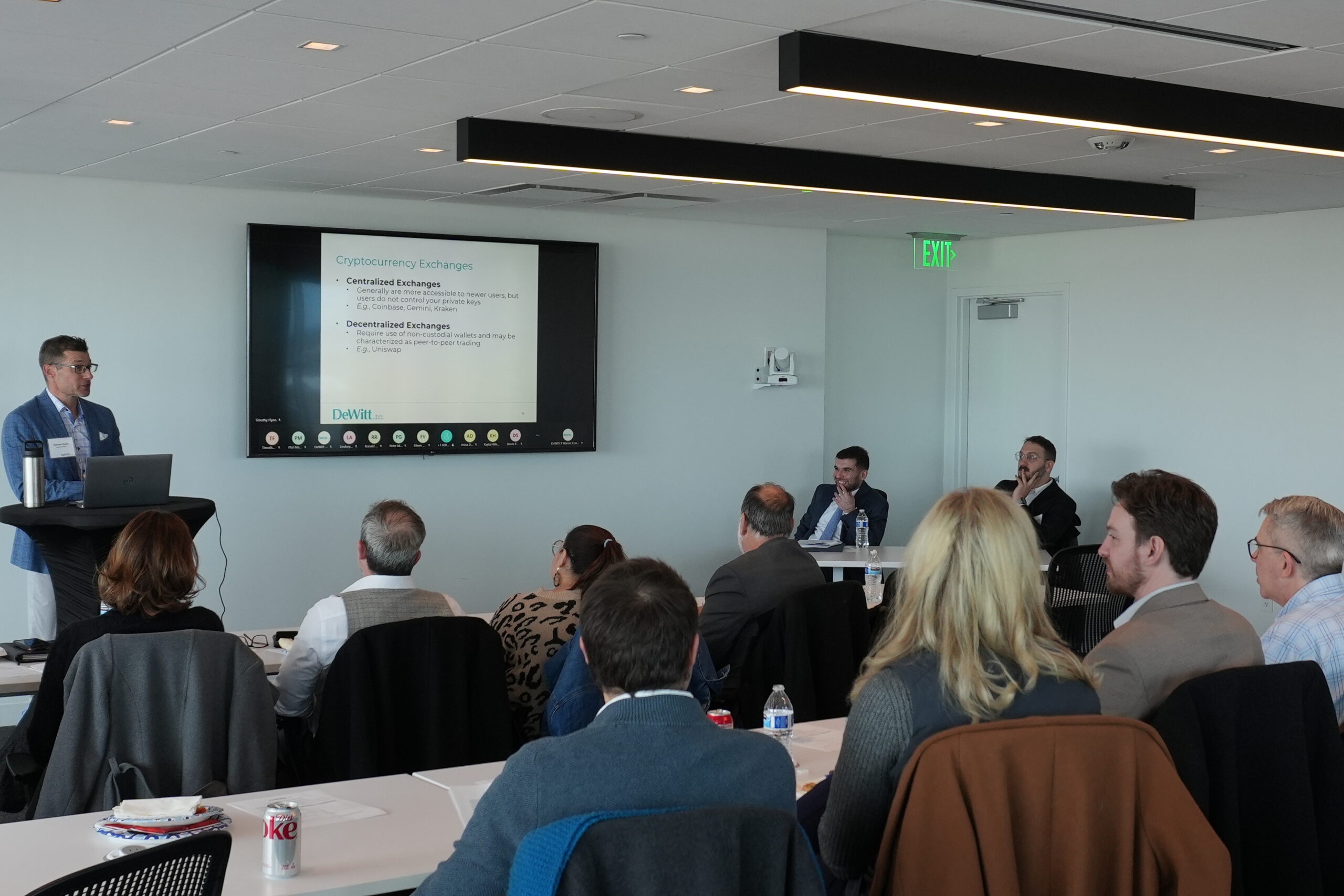A packed-house at a DeWitt LLP in Madison with an audience of attorneys and financial planners focused on learning how blockchain and digital assets currently function from a legal and technical perspective.